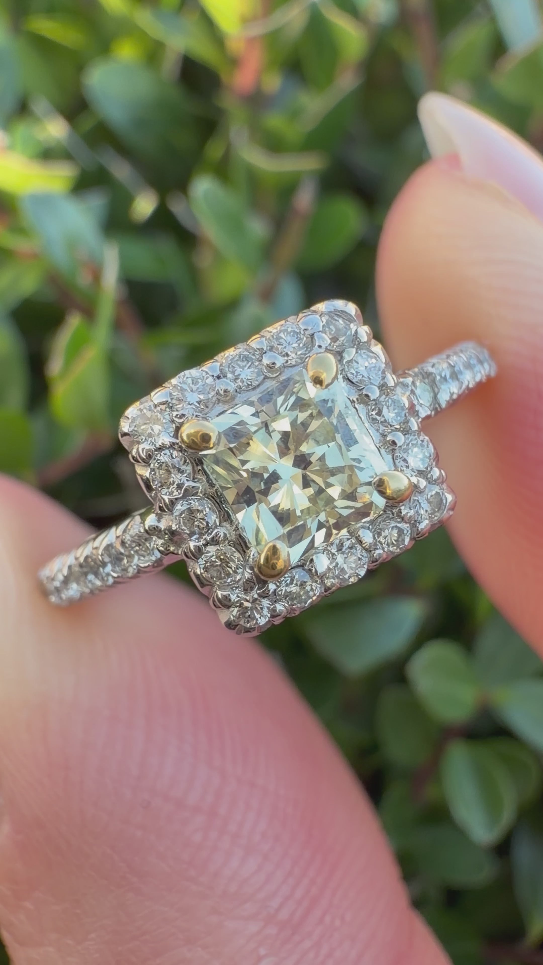 This exquisite ring features a radiant yellow princess cut natural diamond as its centerpiece. The brilliance of the center stone is further enhanced by a dazzling halo of round brilliant cut natural diamonds. These smaller diamonds cascade gracefully down both shoulders of the ring, creating a stunning display of light and luxury. The contrast between the warm yellow of the center diamond and the sparkling white of the surrounding diamonds adds a touch of captivating elegance to this remarkable piece of jewelry