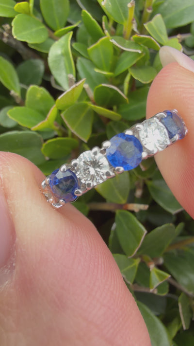 This elegant half eternity ring features four natural round mixed cut diamonds (0.65ct total), perfectly complemented by three round mixed cut natural blue sapphires (0.75ct total). The alternating design creates a stunning contrast of brilliance and rich colour, making this piece both classic and eye-catching.