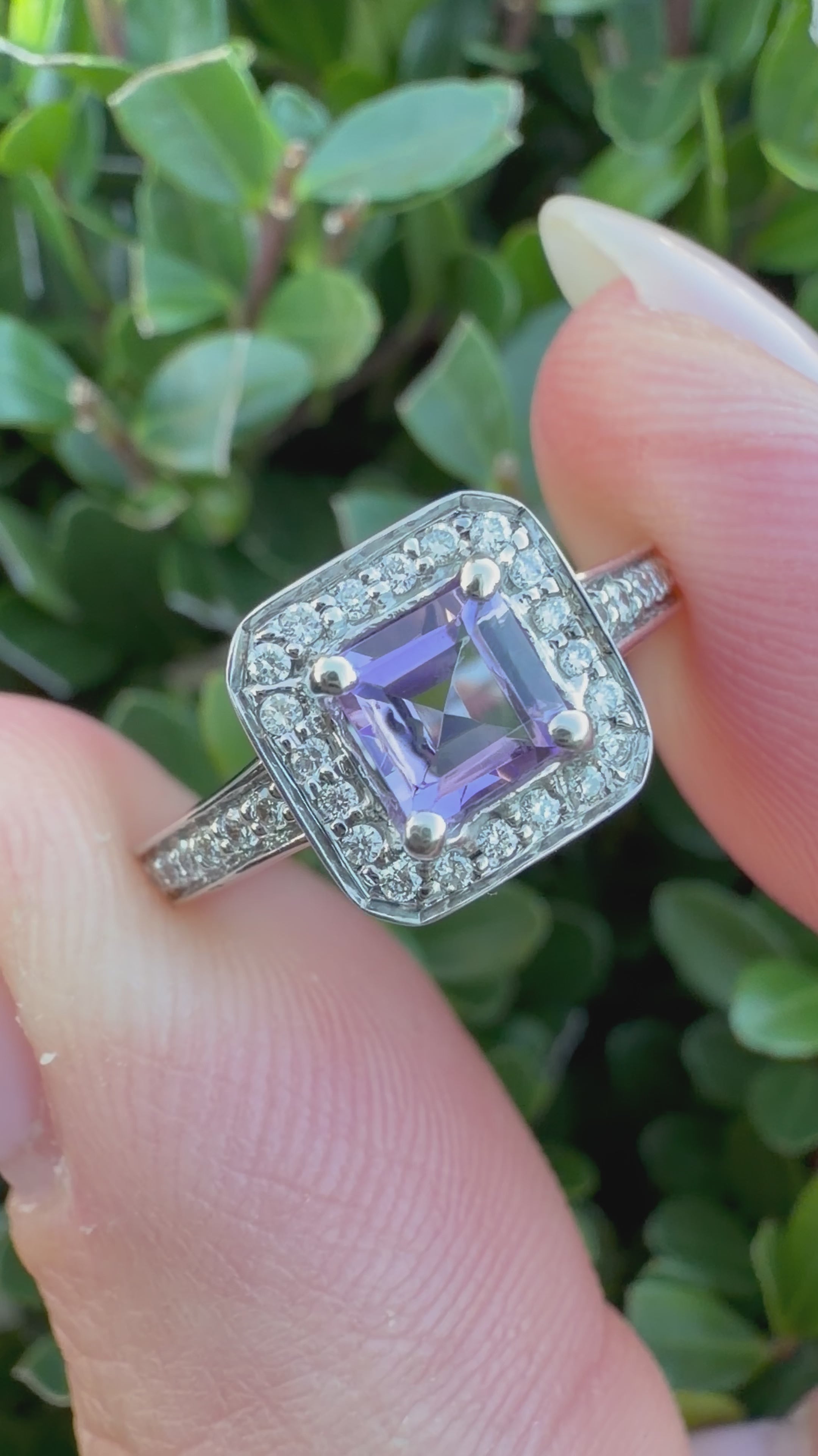 This exquisite ring features a captivating 0.41 carat rectangular mixed cut natural amethyst as its centerpiece. The mesmerizing amethyst is further accentuated by a dazzling entourage of thirty-six round brilliant cut natural diamonds, totaling 0.18 carats. These brilliant diamonds gracefully encircle the central amethyst and cascade down the shoulders of the ring, creating a breathtaking display of light and luxury.