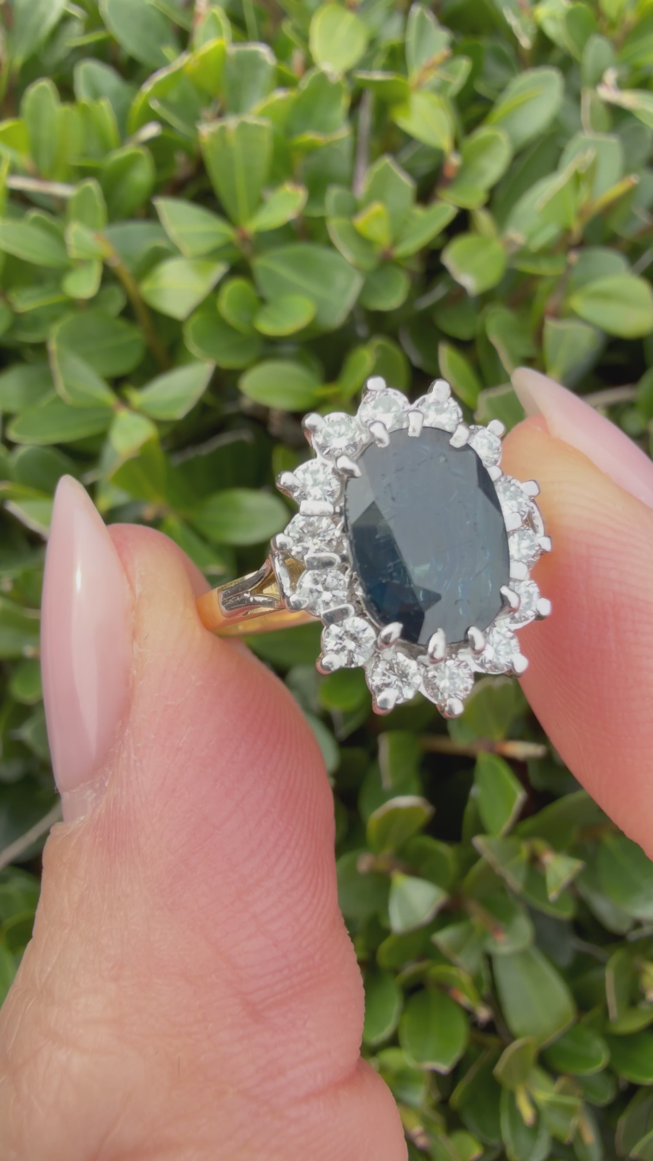 At the centre of the ring sits a captivating 1.35ct natural oval mixed cut sapphire, displaying a rich deep greenish blue hue. This is perfectly complemented by fourteen natural round brilliant cut diamonds, with a total diamond weight of 0.40ct, adding exceptional sparkle and enhancing the overall design.
