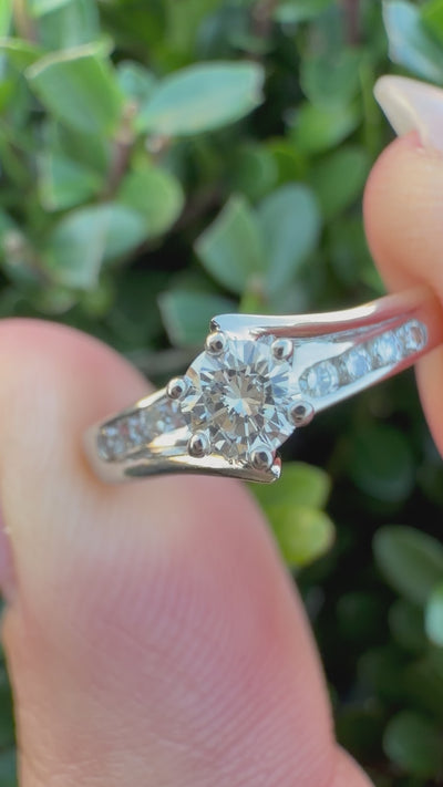 This exquisite ring features a captivating design, centering on a single, round brilliant-cut natural diamond. The brilliance of this centerpiece is further enhanced by a cascade of eight additional round brilliant-cut natural diamonds, gracefully adorning the ring’s shoulders. The meticulous arrangement and selection of these diamonds ensure a harmonious interplay of light, creating a dazzling display of radiance and luxury.