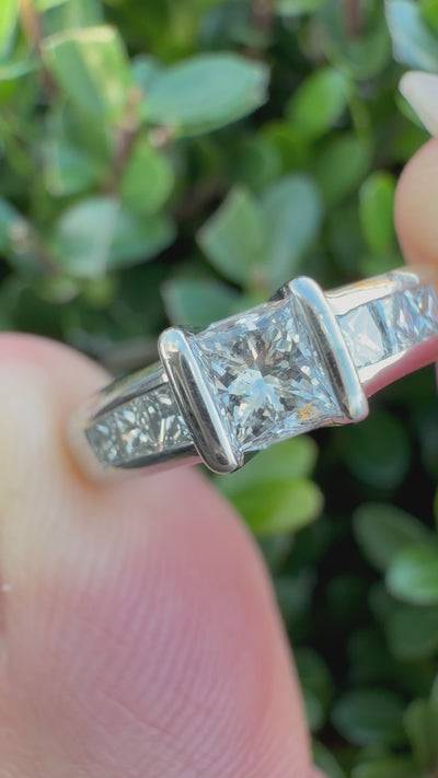 This stunning ring features a classic design with a modern twist. A dazzling 0.30 carat princess cut natural diamond takes center stage, commanding attention with its brilliance and fire. The center stone is flanked by three princess cut natural diamonds down each shoulder of the ring, adding to the overall sparkle and luxury of the piece. The princess cut of the diamonds offers a contemporary feel, while the timeless arrangement of the stones ensures that this ring will remain a cherished treasure for years to come. The band is crafted from high-quality precious metal, providing a durable and beautiful setting for the diamonds. This exquisite ring is the perfect symbol of love and commitment, making it an ideal choice for an engagement ring, anniversary gift, or simply a special treat for yourself.