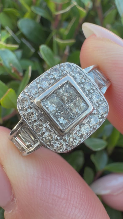 This exquisite ring features a stunning arrangement of natural diamonds. The centerpiece showcases four princess-cut diamonds, each meticulously set to maximize its brilliance. These center stones are surrounded by a dazzling array of twenty-two round brilliant-cut and baguette-cut natural diamonds. These surrounding diamonds create a halo effect, enhancing the overall sparkle and size of the center stones. The arrangement continues down each shoulder of the ring, forming a captivating display of light and luxury. The combination of different diamond cuts adds depth and dimension to the design, making this ring a truly unique and eye-catching piece.