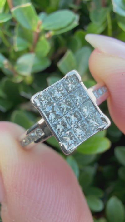 This stunning ring features a breathtaking arrangement of diamonds. The centerpiece showcases twelve princess-cut natural diamonds, meticulously arranged to maximize their brilliance and sparkle. These are followed by a cascade of ten round brilliant-cut diamonds that gracefully adorn the shoulders of the ring, extending the dazzling display and adding a touch of elegance. The combination of the princess and round cuts creates a captivating interplay of light and geometry, ensuring that this ring will capture attention and admiration from every angle.