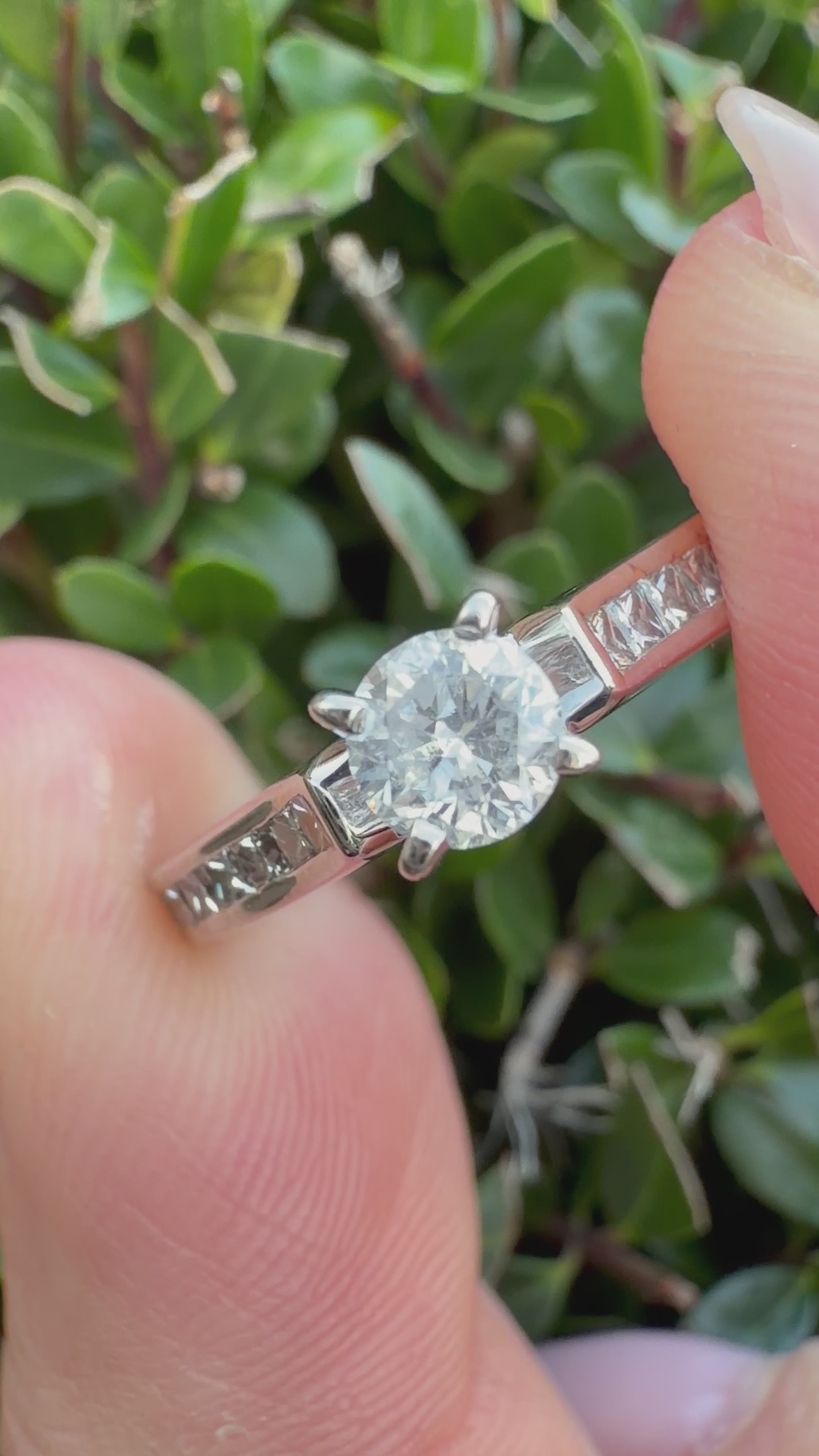 This exquisite ring features a captivating design, with a single, round brilliant cut natural diamond as its centerpiece. The center stone is further enhanced by a dazzling display of ten princess cut natural diamonds cascading gracefully down each shoulder of the ring, creating a breathtaking and luxurious aesthetic. The combination of the round brilliant cut and princess cut diamonds results in a stunning interplay of light and brilliance, ensuring that this ring will capture attention and admiration from all who behold it.
