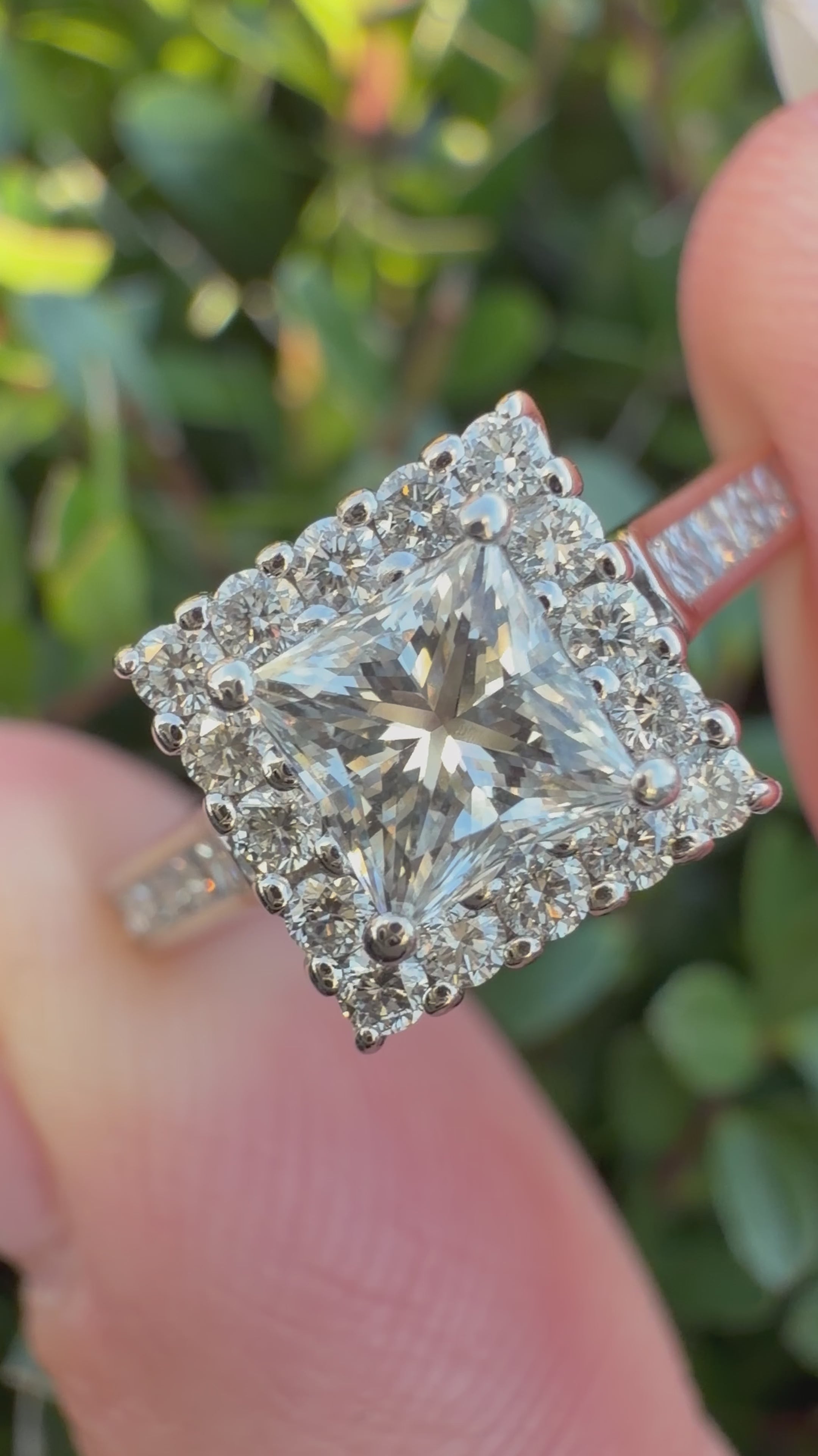 18k White Gold 1ct Natural Princess Cut Diamond Halo Ring certified