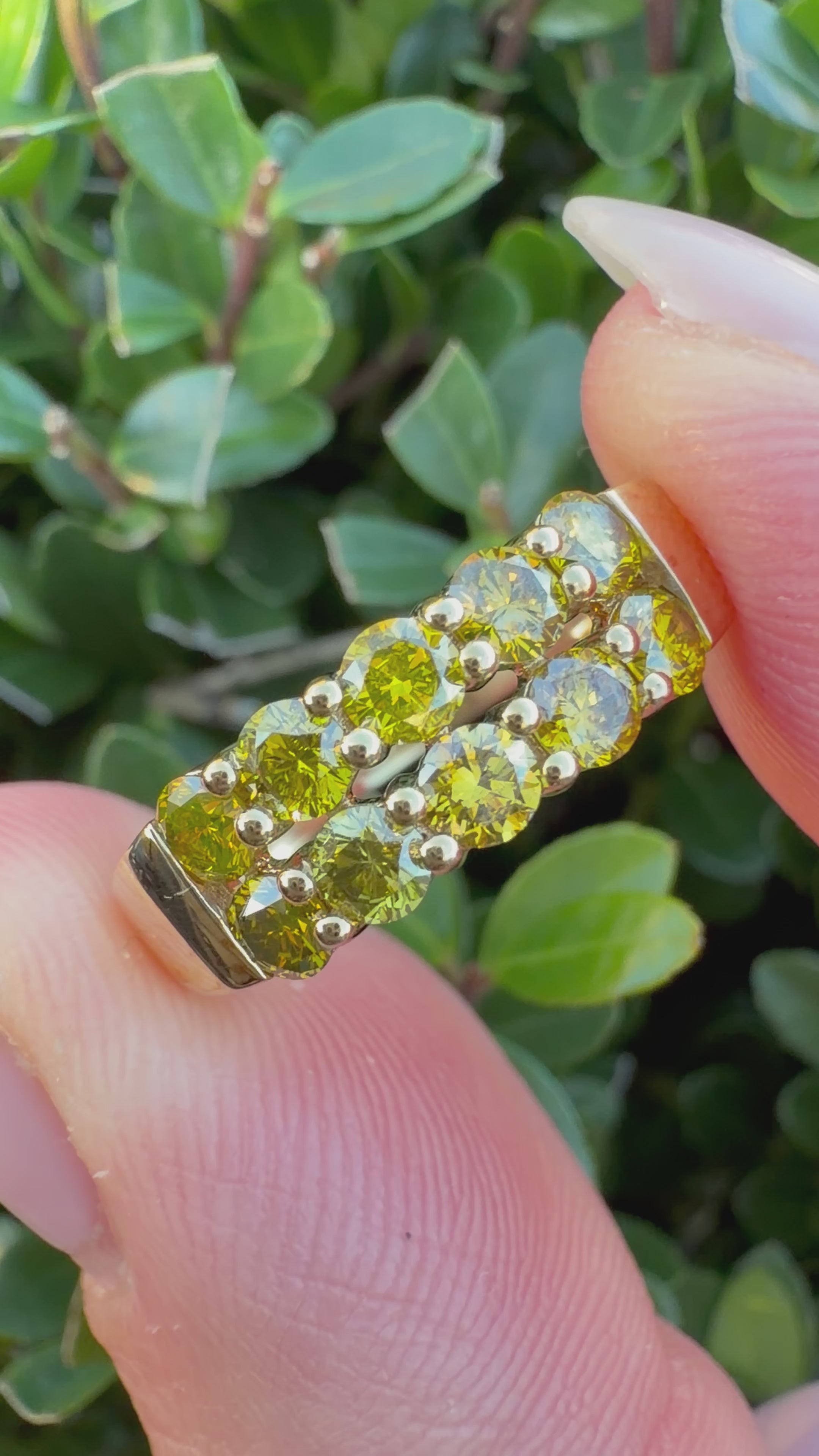 A stunning jewelry piece adorned with ten exquisite, round brilliant-cut natural diamonds, each radiating a captivating greenish-yellow hue. The diamonds, meticulously selected for their exceptional clarity and brilliance, are expertly set to maximize their luminous beauty, creating a mesmerizing display of light and color.