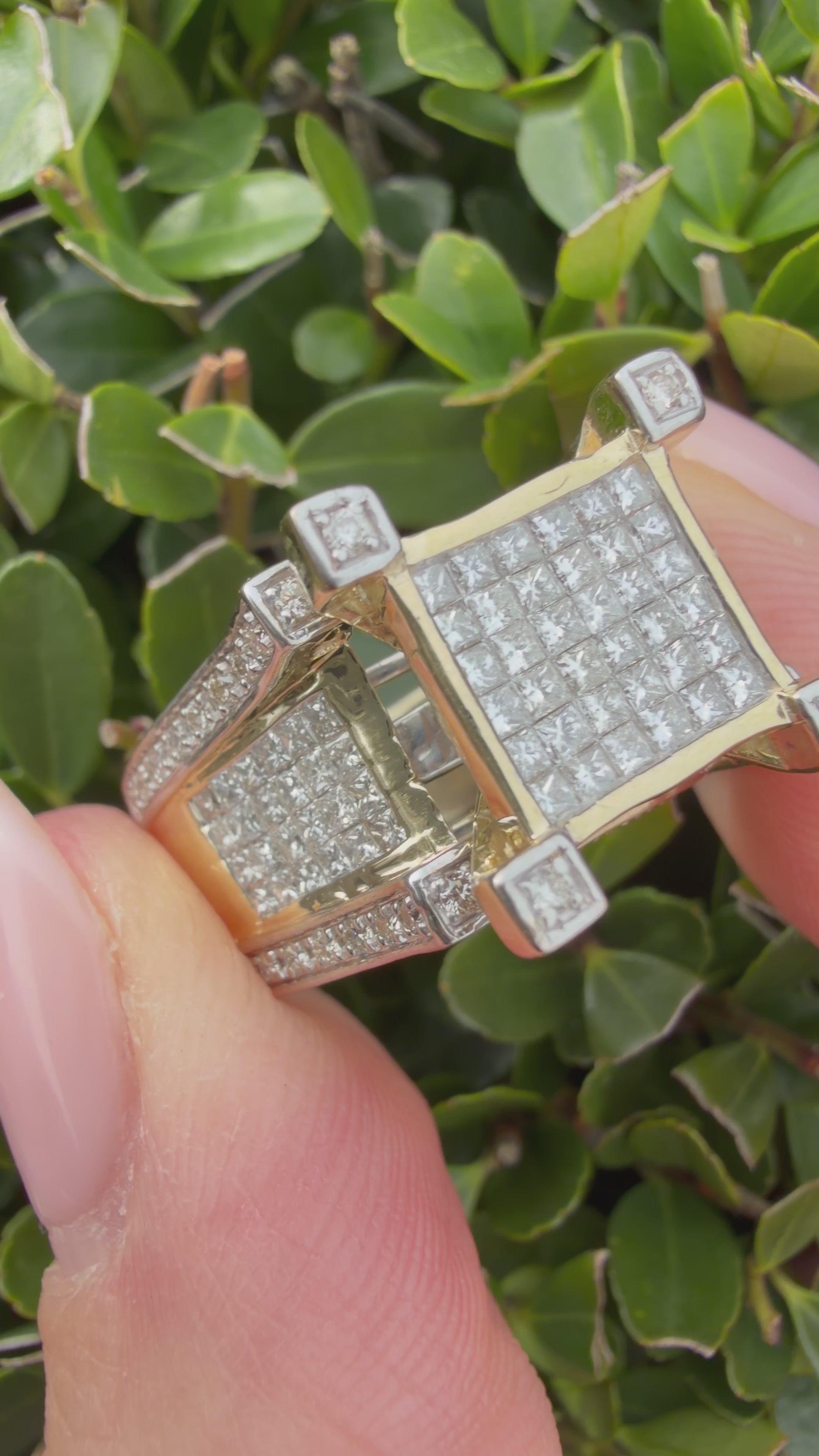 This striking men’s cluster ring features an impressive combination of one hundred and fifty six natural diamonds, including both princess cut and round brilliant cut stones, creating a powerful and highly reflective design with maximum sparkle.