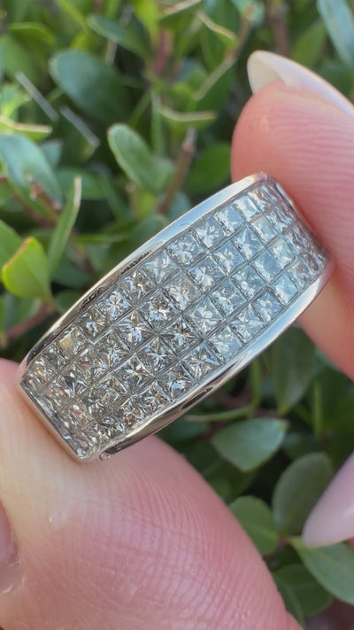 This exquisite ring, a testament to opulence and grandeur, boasts a breathtaking design that features sixty-four meticulously cut, natural princess cut diamonds. Each diamond, a masterpiece of nature’s artistry and the jeweler’s craftsmanship, radiates with an unparalleled brilliance, capturing and reflecting light in a mesmerizing dance of fire and scintillation.